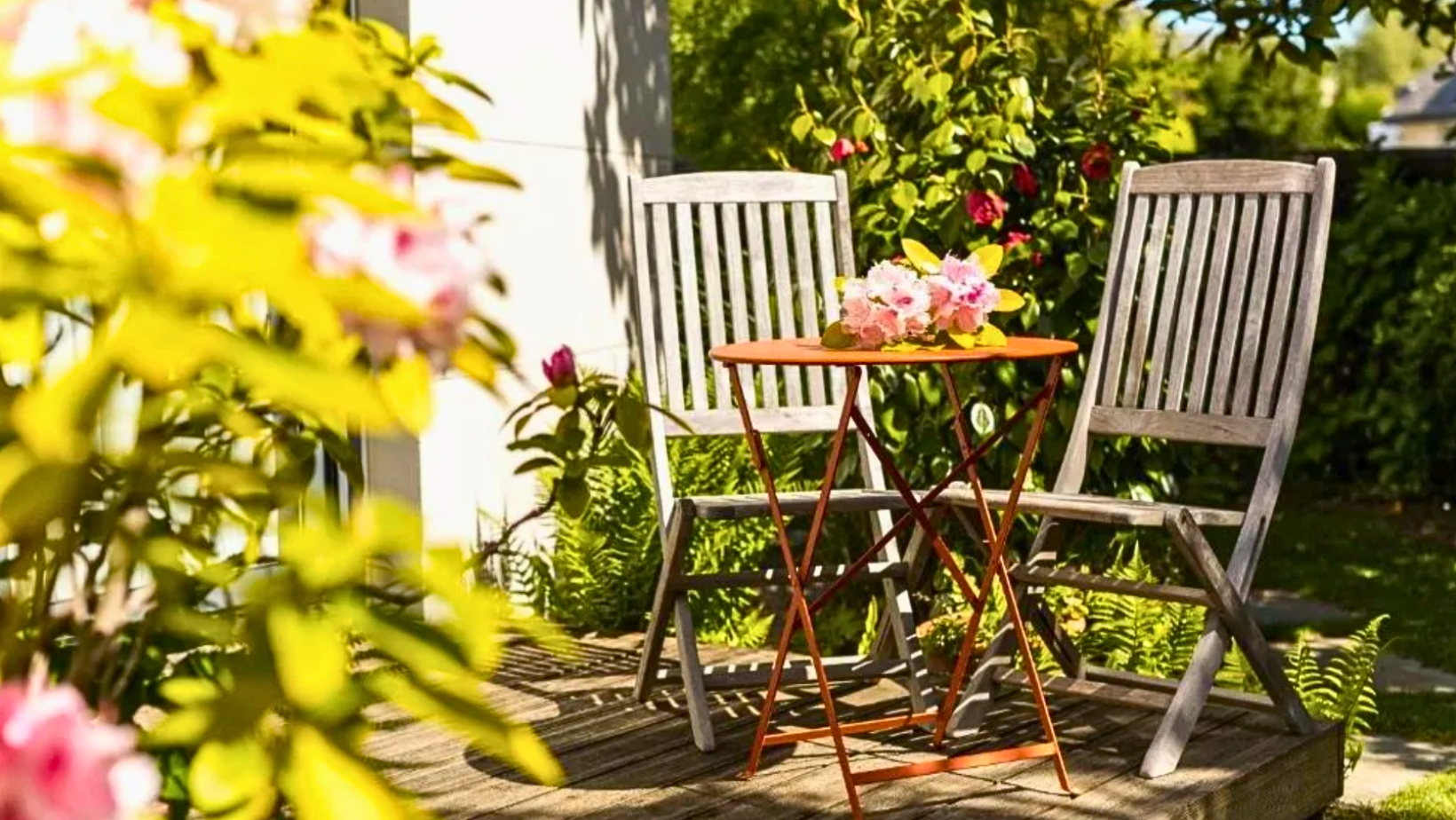 Entrée par la terrasse bois. Vue sur le jardin.